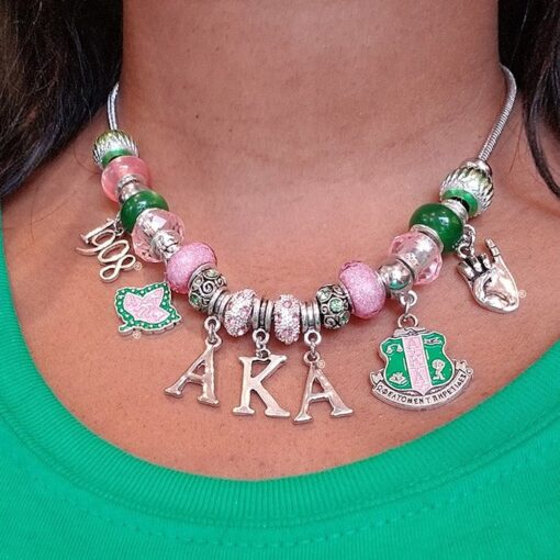 Our beautiful Alpha Kappa Alpha “Cherished” Charm Necklace is adorned with beautiful Pink & Green stones, relics and Sorority charms.