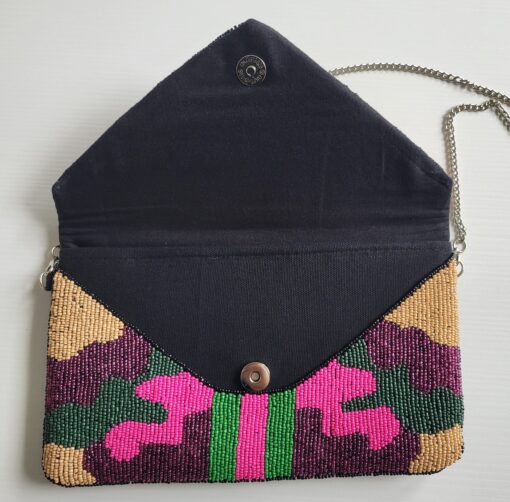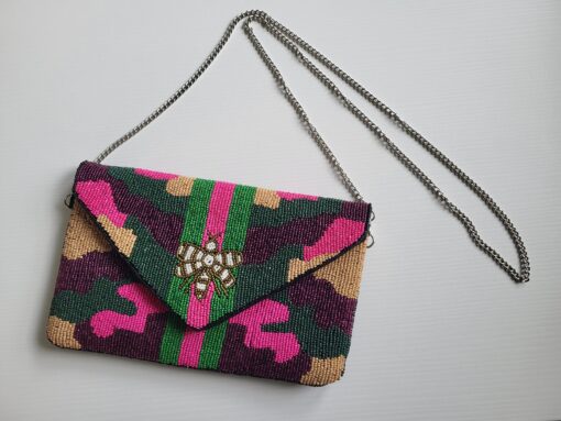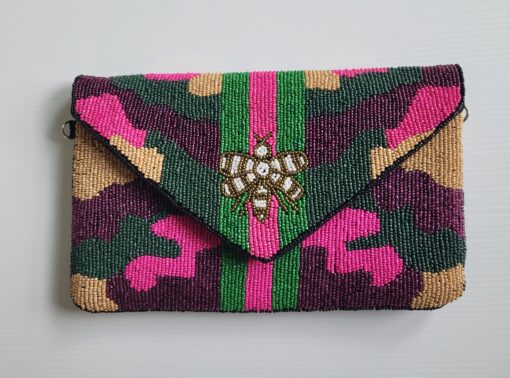 Our Fatigue Honey Bee Seed Beaded Clutch/Crossbody bag is hand beaded and handmade, adding an extra special touch to any look.