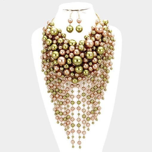 Pink and Green Fringe Pearl Cluster Necklace Set