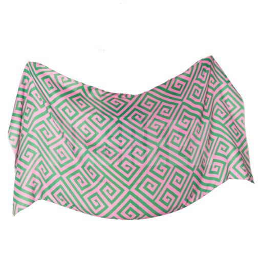 Crafted with meticulous care, this scarf features a striking pink and green zig zag pattern that not only pays homage to the esteemed colors of Alpha Kappa Alpha but also adds a vibrant splash of color to any outfit. The light weight of the scarf ensures it can be worn comfortably in any season, making it a perfect addition to your wardrobe whether you’re accessorizing for a breezy summer evening or adding a layer of warmth in the chill of fall.